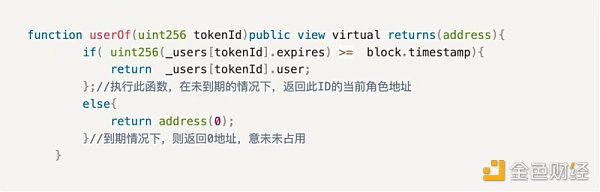 查询的逻辑很简单,按指定的NFTID查询_users的user信息即可,但他增加了,if判断,当前块的时间block.timestamp是否会超过设置的过期时间expires,所以此查询仅在时间内有效。