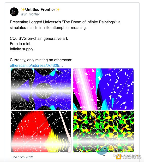 无限——无限 OE 是一种发行方式,其中集合有无限可能供应并且铸币永远不会关闭,比如“The Room of Infinite Paintings”项目。