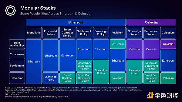 请注意,像 Validiums 和 Celestiums 为 DA 和结算使用独立层的可能性也是存在的。任何结算层都可以使用,只要它接受 Celestia 提供的数据证明就可以了。
