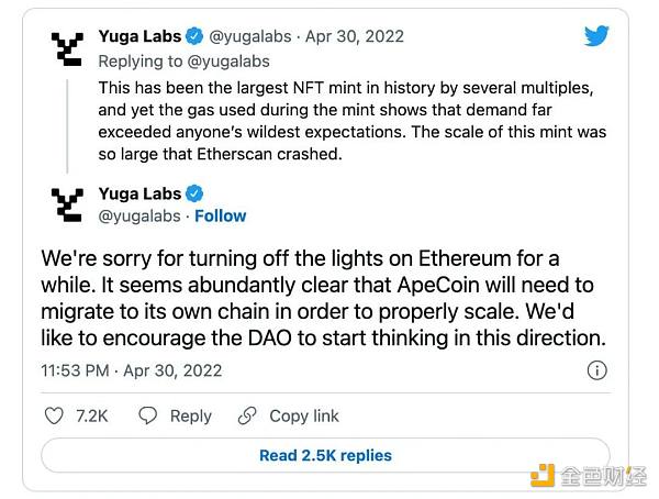 此事过后,Yuga Labs发推为几近崩溃的以太坊道歉,鉴于用户对ApeCoin的需求量极大,加上当前以太坊形式的限制,其社区建议将ApeCoin转移到自己的区块链上,以便更有效地扩展。