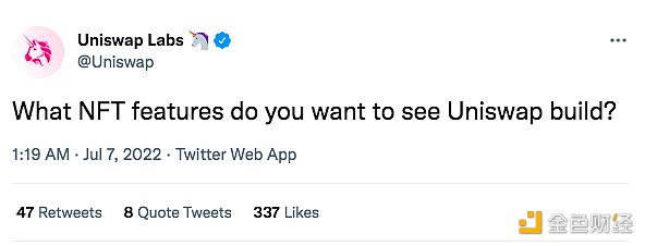 6月22日,DeFi市场龙头Uniswap收购以太坊NFT聚合平台Genie,表示用户在今年秋天就可以直接在Uniswap网络应用程序上买卖NFT,7月7日,Uniswap Labs便在社交媒体向用户征求NFT产品功能意见。其对NFT平台的布局速度令人惊讶。