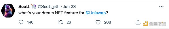 而且在被Uniswap确认收购的第二天,Scott便发推征求关于梦想NFT功能的意见。彼时,用户的讨论热度似不温不火。用户发言大多以“更高的价格”、“让我的钱不涨不跌”等插科打诨的内容,没有提供价值信息。