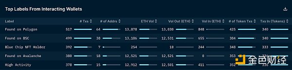 下面的表格细分了从 2022 年 1 月 1 日至 6 月 30 日期间收到 ETH 的前 20 个非实体钱包。排名靠前的非实体钱包包括 ETH 的百万富翁、使用过 EIP1559 的钱包、NFT 收藏家、重型去中心化交易的交易,以及一些私人钱包。如图所示,Vee Friends Series 2 在向非实体钱包转账的前 20 名中占了 5 个;它主要是向被认定为高活性钱包的钱包进行了转账。