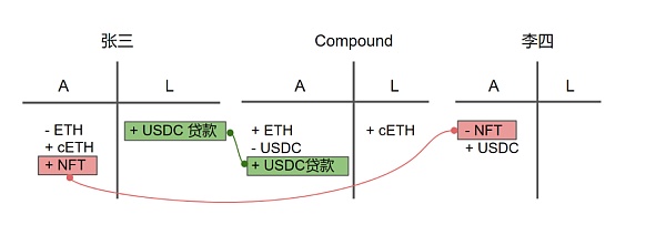 很多时候,我们并不关心资产的数量,而是定性地研究交易涉及到各主体资产负债关系变化,这种时候,可以忽略数字。例如,假设张三将若干 ETH 抵押到 Compound 里那里,借出 USDC,然后从李四那里购买了一个 NFT。假设我们不关心此次交易的具体金额,只是定性分析,那么联合增量平衡表如下: