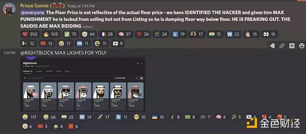 这是 The Saudis 团队在 Discord 中发布的一条公告。简单来讲,一个科学家在 The Saudis 开启 Free Mint 时将一大批 NFT 收入囊中,并在 The Saudis 价格上涨时一路挂单出货,而 The Saudis 团队发现后便採取了行动,将这二百多个 NFT 锁定起来,科学家只能挂单但无法卖出。