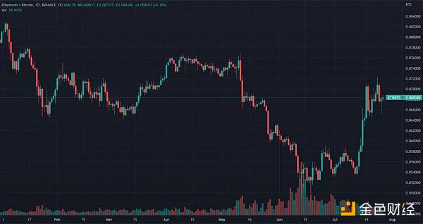 ETH / BTC 比率也经常被用作以太坊的情绪指标,同时剔除可能影响整体加密货币价格的更广泛的宏观波动。自 5 月以来,主要的加密货币事件——如 Terra 和三箭资本——使情况变得更加糟糕,因为据称在此期间这两种资产都被强制出售。然而,自 7 月初以来,ETH/BTC 已经上涨了 20-30%,刺激了进一步的合并叙事。