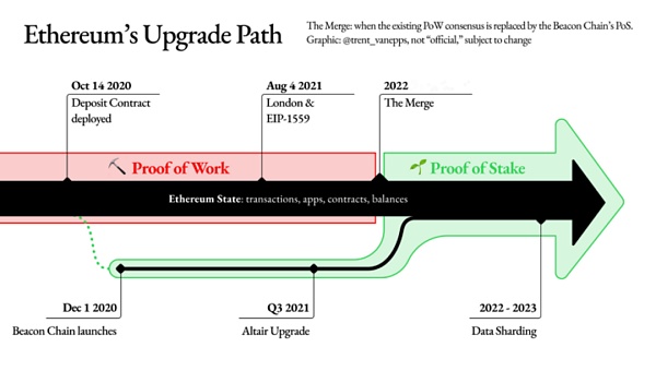 而原链仍然作为执行层以 PoW 形式运行,以太坊进入一个PoW+PoS混合挖矿的阶段,为整个网络向PoS过渡做铺垫。按照路线图,以太坊会在2022年进行“merge合并”,之后再进行分片。