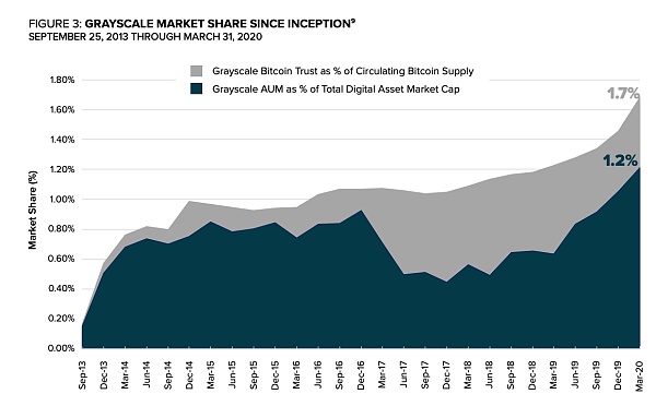 截止2020年3月31日,投资者已经通过Grayscale持有约31.1万枚比特币,占比特币流通量的1.7%。