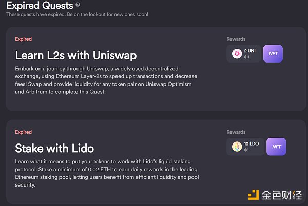 RabbitHole是一个早期的Web3任务管理平台,支持Web3应用发布不同的游戏任务,引导用户与产品进行交互,以体验和熟悉产品的主要功能,用户完成任务后即可获得相应的奖励,包括XP(经验值)、项目方的代币奖励、NFT等。以Uniswap发布的任务为例,只要用户通过以太坊二层扩展方案Arbitrum或Optimism上的Uniswap完成任意资产的交易以及提供流动性后,即可领取奖励。