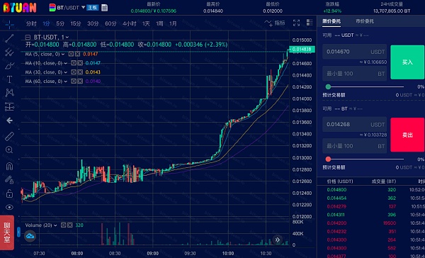 从去年开始,币团对BT进行了通缩,并将当季净利润的50%用于回购BT,直至流通量由10亿变为1亿,下次回购时间预计在5月初!也就是说,用户所持有的BT会在回购过程中最少增值10倍!并且受供应量缩减消息的影响,BT价格应声上涨,价格走势良好也会是持久的状态,有望持续向上突破。