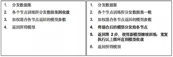 然而,这种方法不能用于损失函数为非凸的训练。2010年,McDonald等提出使用遍历性参数混合方法来保证分布式训练算法在非凸损失函数上的收敛性。其区别在于,各个节点之前所用方法为将每个数据集训练到收敛以后再进行参数混合,而遍历性参数混合方法则强调尽早混合,即在所分发数据集上完成一轮训练后立刻混合参数,并将混合好的参数分发给集群节点,作为下一轮训练的基础模型。两者的伪代码如图表 1所示,其中黑体部分为两种方法的差别。