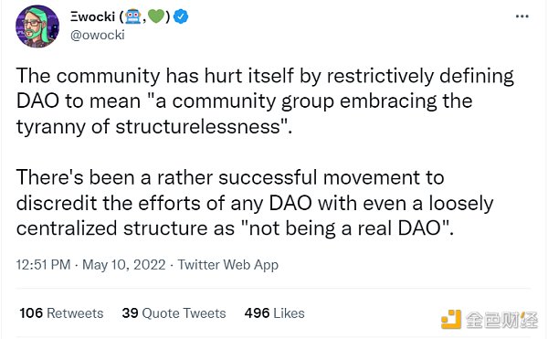 Gitcoin 的 Kevin Owocki 在一个 Twitter 串推上讨论了这个问题,他指出,去中心化可以指「通过无需许可的代币进行去中心化治理」,而不是「混乱的个体松散网络」。