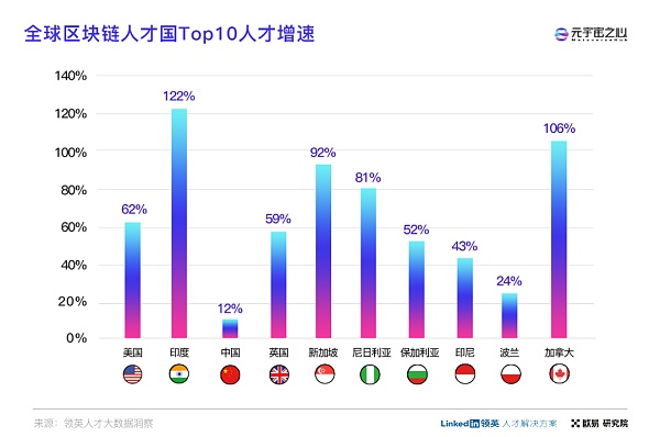 正是在这样的大背景下,在最近全球知名招聘平台领英(LinkedIn)与欧易OKX联合推出的《2022全球区块链领域人才报告-Web3.0方向》中显示,截止2022年6月,领英全球会员中区块链领域从业总人数同比增长了76%,其中美国、印度、中国位列全球前三大区块链人才国。