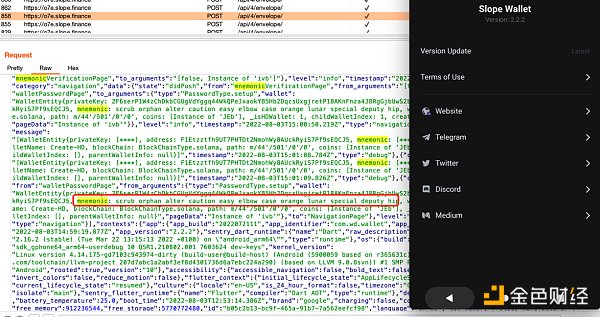 继续分析 Slope Wallet,我们发现 Version: >=2.2.0 的包中 Sentry 服务会将助记词发送到 "o7e.slope.finance",而 Version: 2.1.3 并没有发现采集助记词的行为。