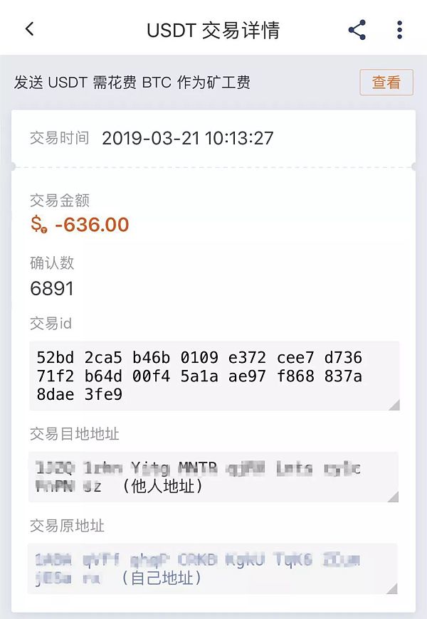如上图,是比特派钱包的USDT转账。