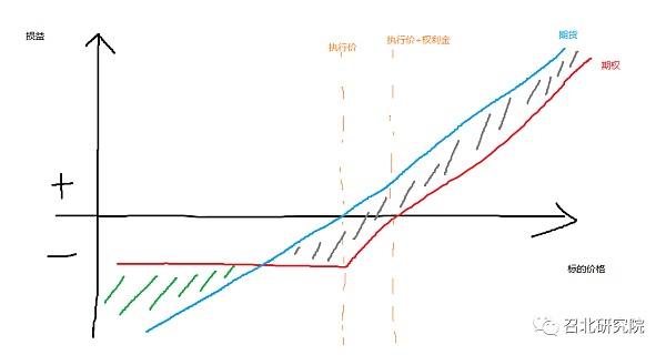 单看payoff,本质上期权和期货是用灰色区域和绿色区域做了一个交换,至于这波交换亏不亏,不太好说。