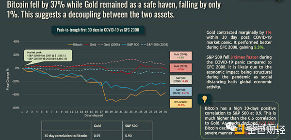 b. 疫情袭击全球的三十天(2月19日为统计起点)内,相比黄金仅下跌1%(2008经济危机期间上涨5.3%),比特币整体下跌了37%,二者存在脱钩。标普500则由于全球经济停摆导致的经济衰减,下跌速度达2008年经济危机的三倍