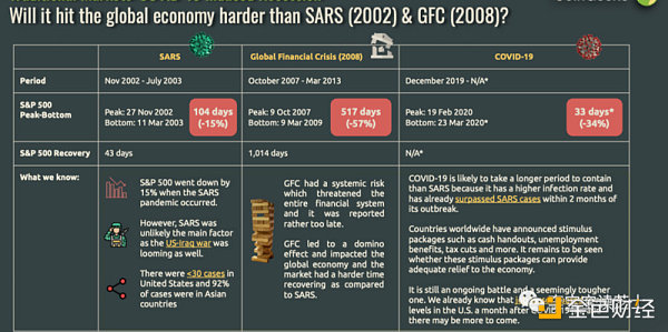 c. 关于COVID-19引发的经济衰退是否会比SARS(2002)和GFC(2008)对全球经济的冲击更大,后市如何发展我们不得而知,但是对比可发现:COVID-19本身比SARS感染时间更长,感染率更高,疫情爆发后两个月就迅速扩散到全球每一个角落,相比SARS抗疫难度更大,而SARS主要受影响国家为亚洲国家,当时标普500指数下跌仅15%,对比本次疫情对比意义不大;0808年全球金融危机本质是金融体系存在系统性风险,多骨诺米牌效应对全球经济造成了更大影响,而本次疫情袭击美国一个月,其失业率就飙升至创纪录水平,相比单纯金融影响,本次疫情对经济的影响更为深远