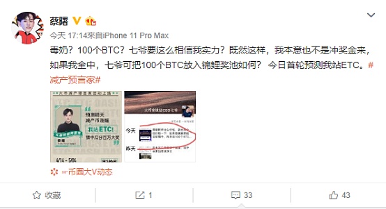 面对七爷的100个BTC喊话,蔡曙发微博回应: