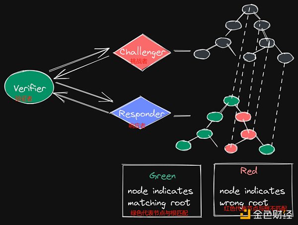 构建为 OR 提供欺诈证明的独特方式之一是在 rollup 上让全节点和轻节点玩一个分割游戏。分割游戏是在两个节点之间进行的,一个是挑战者,一个是响应者。挑战者将通过作为验证者的第三个节点向响应者发送一个查询。响应者对该查询的答复将通过同一渠道进行。在收到挑战后,验证者将把查询转发给响应者,随后响应者将产生一个响应,并发回给验证者和挑战者。验证者将持续进行检查,以确保两者之间不存在不匹配,也不存在恶意行为。验证者的作用是确保响应者没有发送错误的 Merkle 树,而挑战者的作用是确保响应者遵循正确的根。如果响应者能够为自己辩护,那么游戏就会照常进行。这个分割游戏的结果是,诚实的挑战者和响应者总是会获胜。
