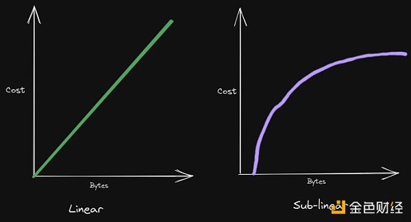 Celestia 的区块验证工作与目前其他区块链有很大不同,因为区块可以在次线性时间(sub-linear time)内被验证。这意味着,与成本的线性增长相比,吞吐量会随着成本的次线性增长而增加。那么,这在纸面上看起来如何呢?让我们来看看。