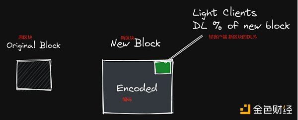 DA 证明是指当你要求正在发送的区块,要进行编码擦除。这意味着原来的区块数据现在被扩大了一倍,然后新的数据被编码为冗余的数据。Celestia 的擦除编码将区块的大小扩大了 4 倍,其中 25% 的区块是原始数据,而 75% 是复制的数据。因此,如果区块想要进行欺诈,就要求不良行为的定序器(sequencer)或类似的东西必须扣留超过 75% 的区块数据。