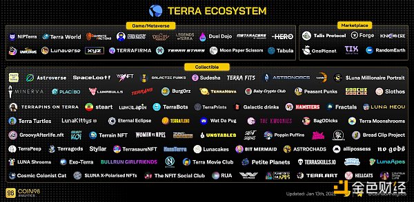 在DeFi之外,Terra也有一个新兴的NFT和游戏生态系统正在建立。在交易数量上仅次于Mirror Finance,RandomEarth是Terra的主要NFT市场。Galactic Punks是Terra上最大的收藏品,可能是LUNAtics(Terra的粉丝)中最常见的个人资料图片。