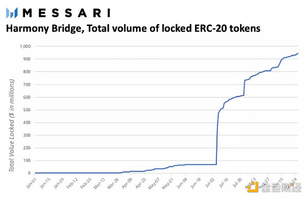 TVL 增长的一个方面来自以太坊的桥接资产。Messari 展示了 Harmony 以太坊桥 TVL 随着时间的推移的增长: