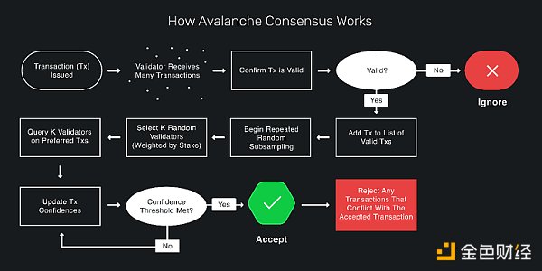 与以太坊愿景相似,Avalanche也致力于在保证去中心化的前提下,提高网络的可扩展性和安全性,在这宏伟蓝图中,子网是关键的一环,在弄清楚子网是如何实现这一目标前,我们先了解下其采用的Avalanche共识机制。该共识机制是基于一种“随机二次抽样”共识算法,简单来讲,就是节点将一笔交易发送给一组随机选择的验证者,询问他们是否认为这笔交易有效,最后将大多数验证者的看法作为改组的反馈结果,然后换一组同样数量的验证者,重复上述过程,直至连续获得相同结果的次数达到一定要求后,节点将根据该结果做出相同的判断。