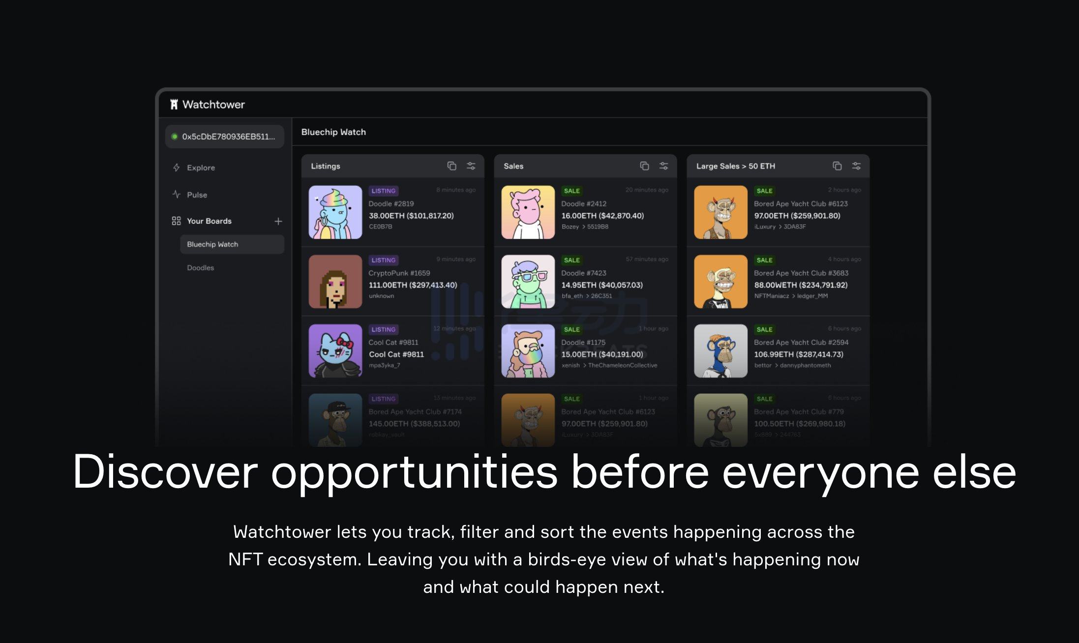 Watchtower 允许 NFT 投资者和交易者跟踪、过滤和分类整个 NFT 生态系统中发生的事件,以便更好地发现、评估及利用潜在的市场投资机会。