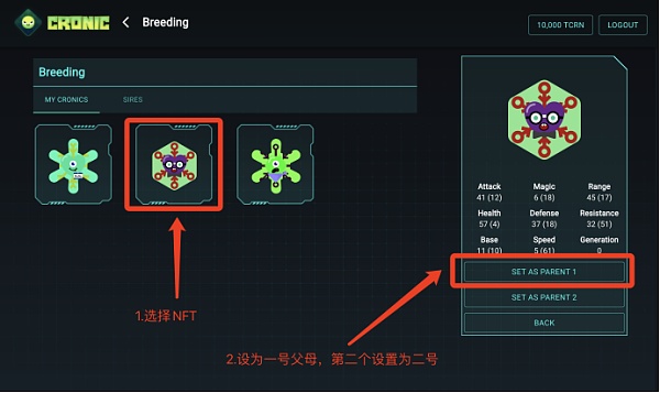 如果你是一名拥有2个Gen0 Cronics的用户你可以将在右侧点击SET AS PARENT 1(设为1号育种父母),然后再去选择第二个Cronics,在右侧点击SET AS PARENT 2(设为2号育种父母)。