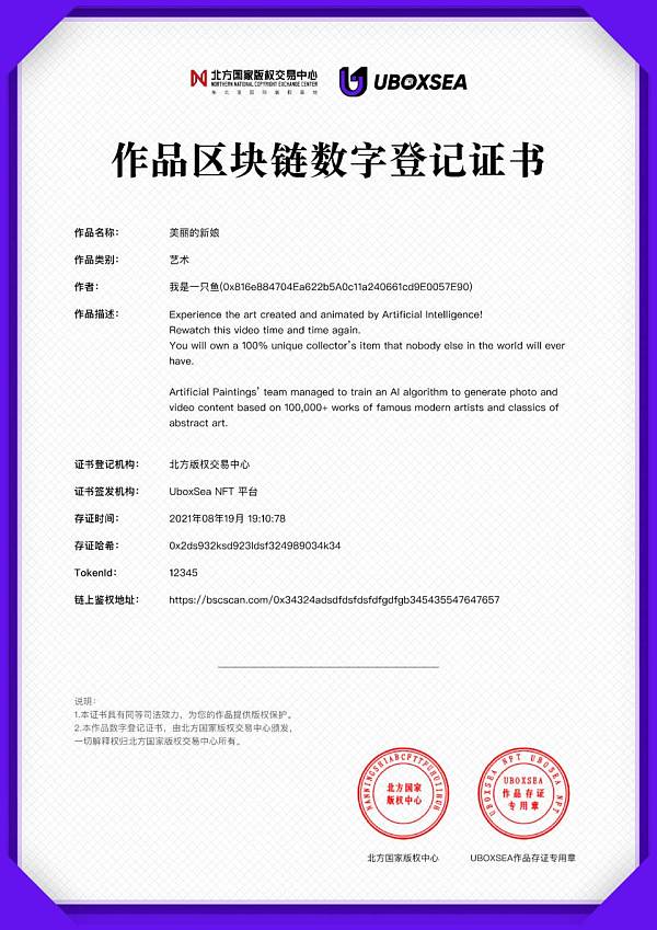 原创作者在 UBOXSEA 平台上铸造 NFT 时,可以免费享受原价 399 元的版权登记服务。版权登记服务由国家授权的业务机构提供,通过登记的 NFT 可分别获得对应的电子、纸质版权证书及一个唯一可查且无法篡改的数字身份 ID。