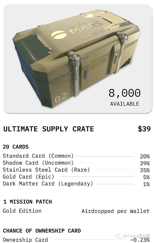 补给箱是 NFT 包并包含数字交易卡。卡片具有殖民地所需的不同车辆、设备、建筑物和宇航员。