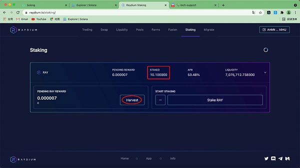 点击红圈处的“Harverst”可以收获已产出的RAY代币奖励。