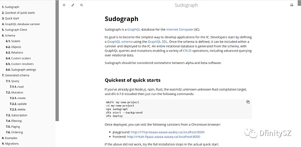 Sudograph是Dfinity上的graphQl数据库,其目标是成为构建Dfinity Dapp最简单开发工具,使用Sudograph时开发人员首先要使用GraphQl SDL定义成GraphQL模式,一旦定义了模式,就可以将其包含在容器中部署到Dfinity网络上,一个完整关系的数据库就是是从模式中生成,GraphQL查询支持各种CRUD操作和对关系数据的高级查询。