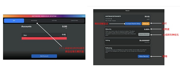 上图右侧页面允许用户创建和管理神经元,以便参与网络管理并在开放式管理中发挥积极作用。用户通过在指定的时间段内“锁定”他们的ICP来创建神经元,从而使他们能够通过对提案进行投票以换取ICP奖励来参与治理。