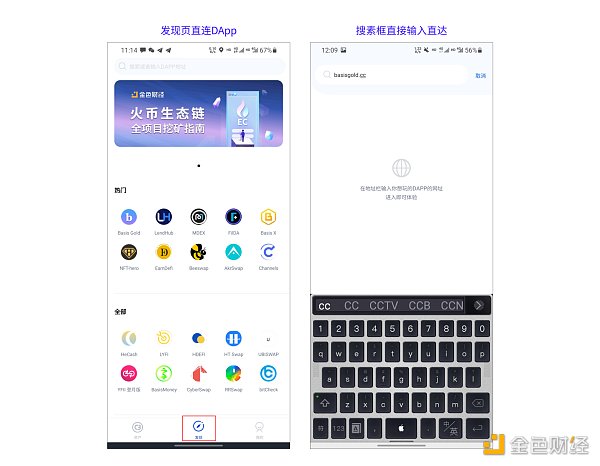 4、点击底部的[发现]菜单,即可使用已上架的火币生态链的DApp。(一大波DApp在路上)为了您资产的安全,建议在选择DApp的时候尽量选择上架钱包的DApp,谨防遇到一些高风险的DApp项目;若未找到您想要的DApp,可在上方搜索框输入DApp官网地址,进入直连。