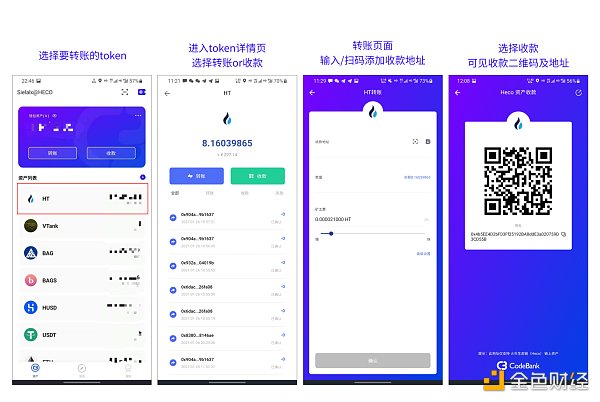 1、选择需要操作的代币(例如HT),点击左下角[转账],收款功能点击后可以获取收款二维码和复制收款地址,同使用CodeBank钱包的用户可以直接扫码支付。(如遇到其他平台二维码,可能会有兼容性问题,此时最好可以使用复制粘贴功能操作)