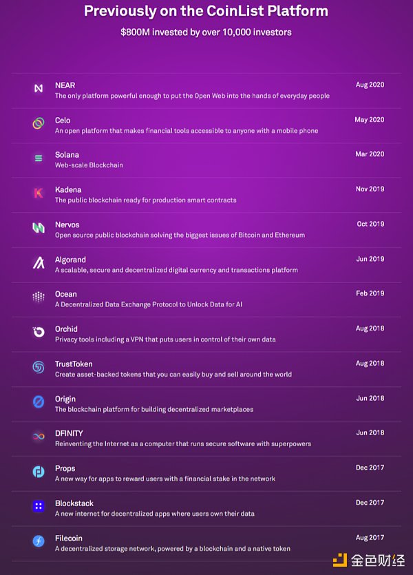 首先,很多重量级项目是在Coinlist独家完成ICO的,包括Filecoin、DFINITY、Algorand、Nervos等等,也就是如果你要参与这些项目的公售,只有Coinlist一个渠道。近期大热的Flow就是在Coinlist进行售卖的。