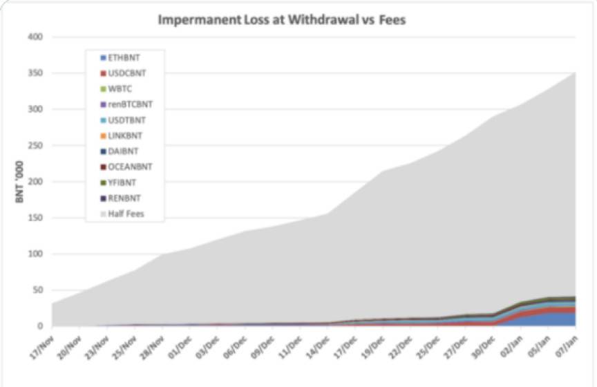 Bancor 使用所有流动性池中产生的一部分代币兑换费用(swap fees)来支付协议范围内已出现的无常损失。在所有赚取的代币兑换费用收入中,28% 将用于支付流动性提供者遭受的无常损失,而且,这个过程并不会铸造或发行 BNT 代币来对此进行补贴。
