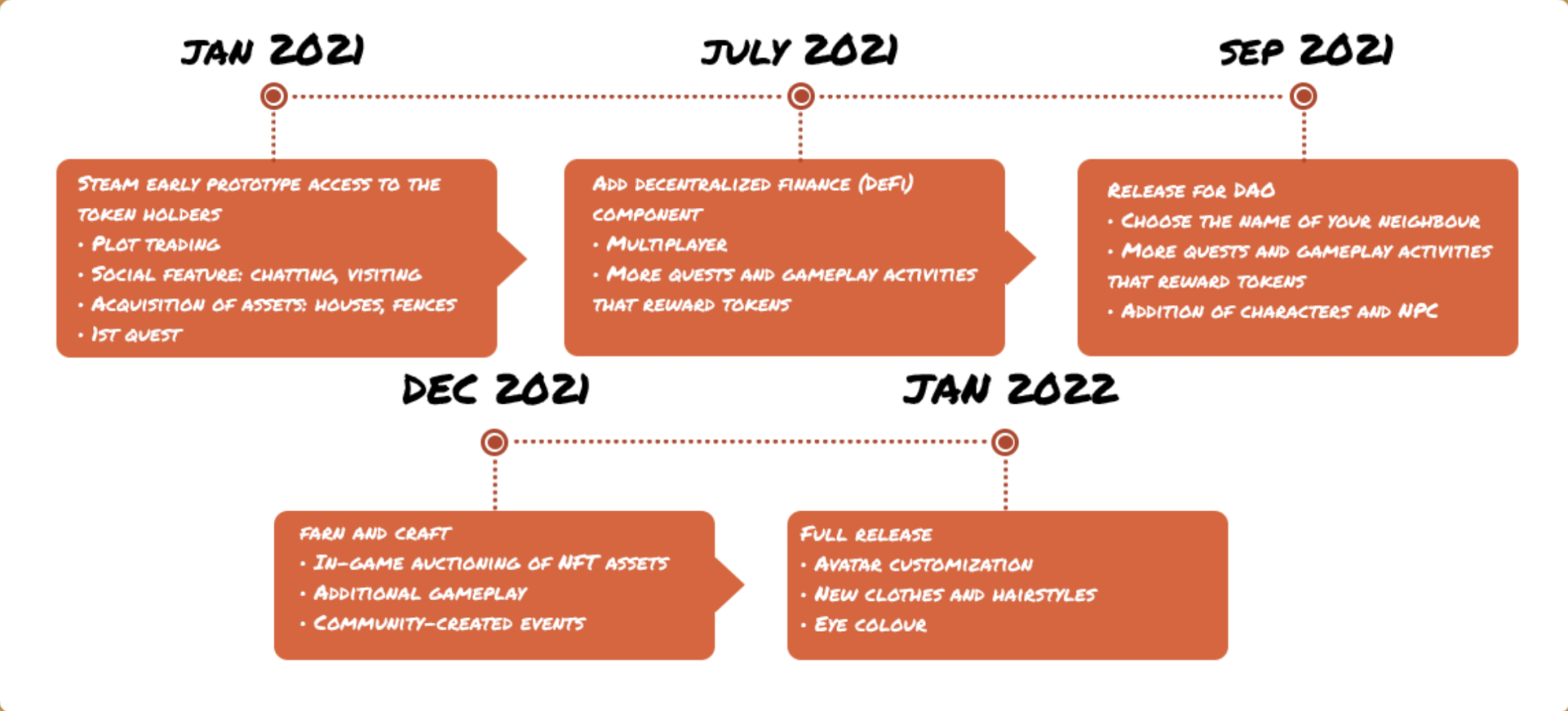 从路线图中可以看出,My Neighbor Alice在年中正式发行后,将即刻接入DeFi插件,随后开放社区委员会治理、NFT拍卖、增加游戏角色等多个功能和玩法。