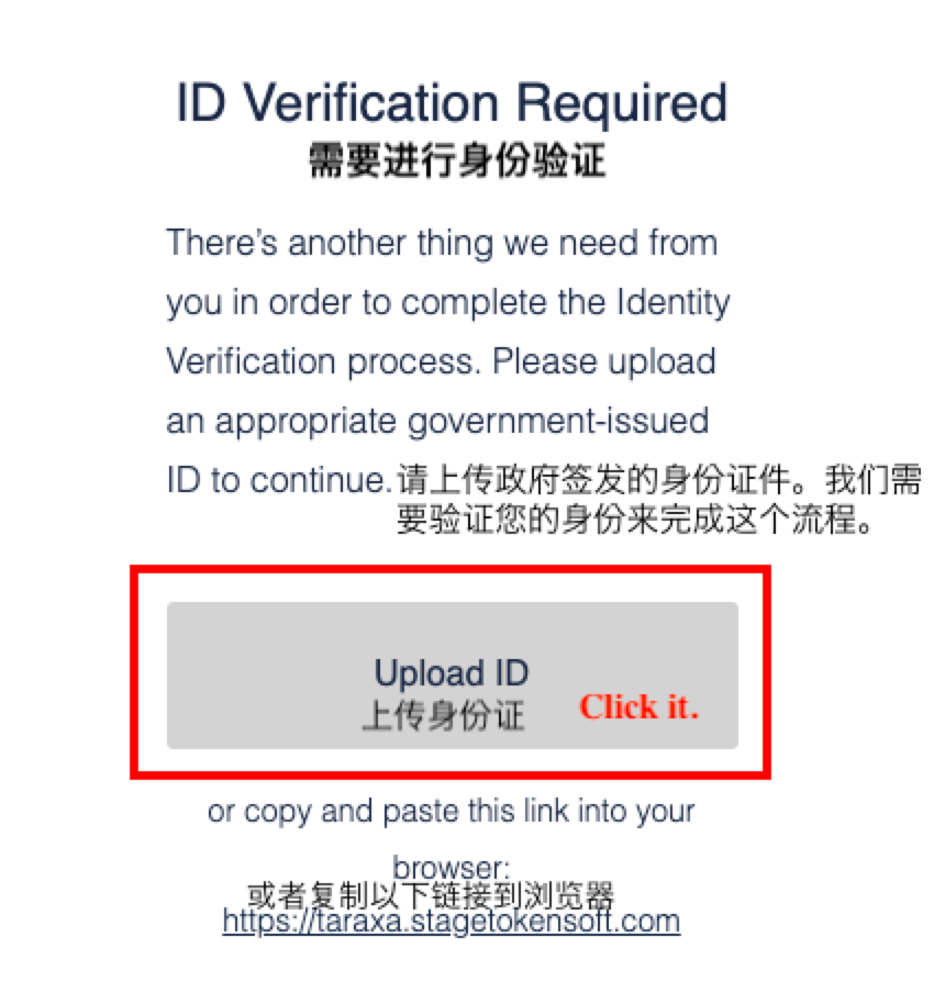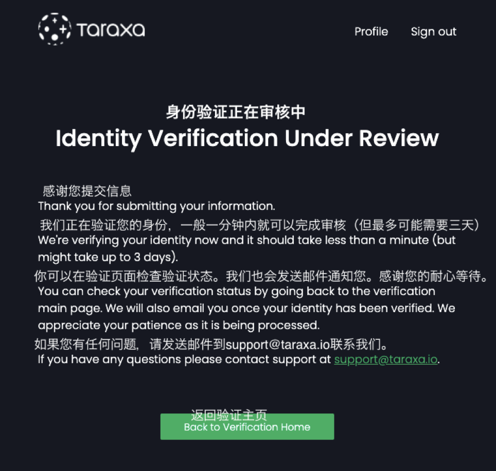 在您提交表格后,您将看到一个页面显示「需要额外文档」。此时,您也将收到 Taraxa 发送的邮件,提示您上传身份证件照片。