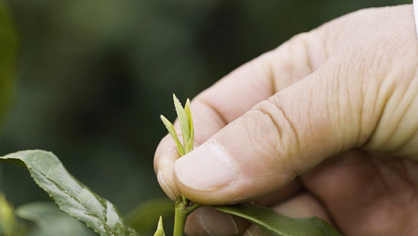 “今天温度还是比较高的,茶树长起来就非常快,你看现在这个芽头已经是比较标准的了,我判断明天如果不采掉,就要长得不合格了,所以这批茶明天一定要采掉。”戚英杰望着远处的茶园说道。