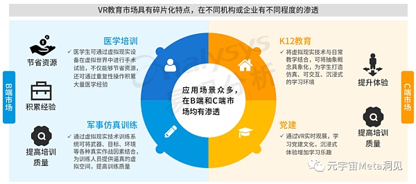 “VR+教育”在众多领域有所渗透,除了教育行业本身,军事仿真训练、医学培训、党建等众多跨领域的教育方面也开始应用VR。对于不同的应用场景,VR发挥着不同作用,针对C端市场,VR极大提升了消费者体验,针对B端市场,VR减少培训成本,并且让难以实现的教学场景在虚拟世界中重现。