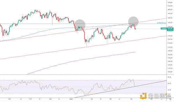 ETH联动大盘回落,价格最低跌至120日线附近暂时止跌,120线还保持下滑姿态,形成不了强力支撑,后面有可能跌破,RSI最低跌至中期上行趋势线一带,一旦跌破,后续调整空间将加大,目前周线阴包阳的状态,月线高位死叉,反弹也未能重新站上,注意风险,反弹短线可以考虑高抛,短期压力3300,强压3500-3600,下方较强支撑3000。
