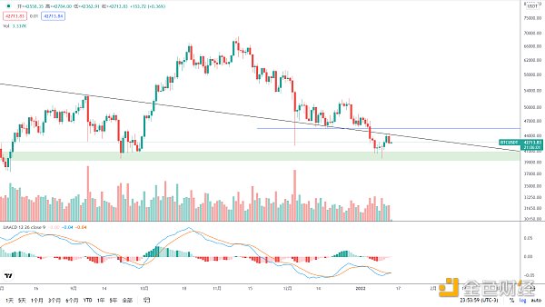 1900/1/1 0:00:00BTC从前期见顶到目前这段时间的走势,依然可以看作一个大级别下降楔形三角收敛,这种结构一般属于潜在反转形态,前期大跌和反弹后的再次回落均未有效跌破趋势线,调整量能开始减弱.
