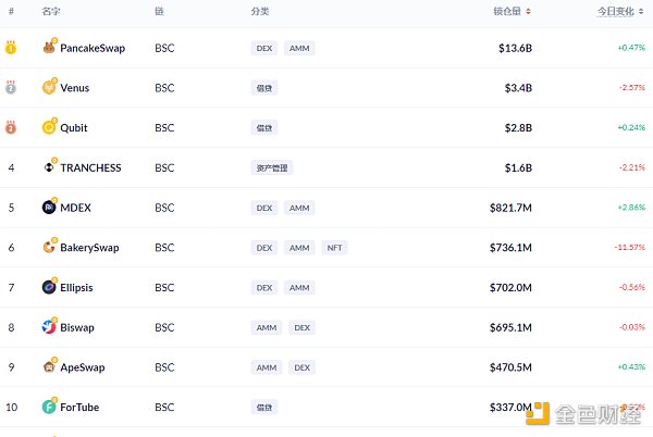 BSC链上DeFi锁定资产前十排名及锁仓量,数据来源:Debank
