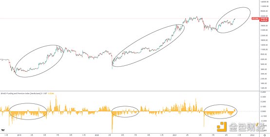 2018年熊市底部,BTC一直处于3000-4000美金区间震荡筑底,相应的资金费率也是一直低位区间震荡,经过18年底6000-3000美金的一波瀑布,市场情绪普遍悲观,看空情绪高涨,情绪酝酿到极致,往往就会迎来行情拐点,后面一路涨至14000美金顶点再回落,而这一波行情拉升初期,价格在涨到8000美金前,资金费率还是处于低位,直至后面价格涨至顶部区域,资金费率才升至高位,这说明在上涨初期,价格越涨,市场恐高情绪严重,那么后续行情一般是继续爆空拉升,直至到达市场狂热阶段。