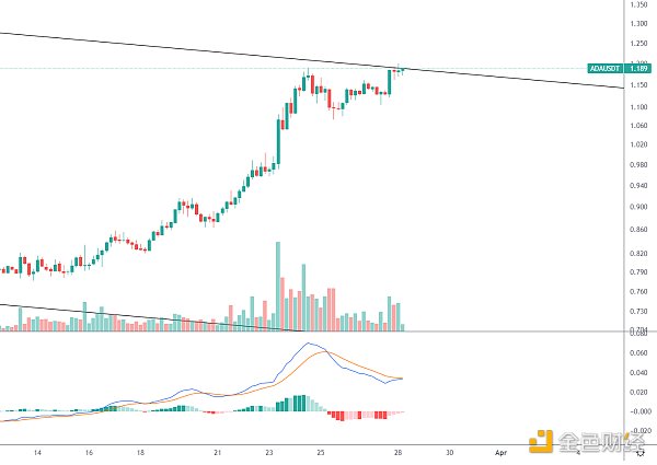 1900/1/1 0:00:00ETH/BTC形成阶段双底,走势强于大盘,昨日放量突破前顶下降趋势线,迎来直线拉升,价格再次逼近周线关键压力线,17年牛顶、今年5月顶部以及11月顶部均在这一带遇阻回落.