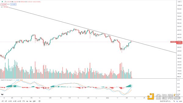 目前仍处于下降趋势线压制下,突破向上空间才能打开,压力区域3200-3220美金,短线可以考虑逢高减仓,目前日线反弹出13,上涨动能开始放缓,中期均线维持向下,近期还是有回调的可能,短期支撑2950美金,中线支撑2800美金,回踩不破可以低吸,中期反弹趋势仍在,调整后有望继续上攻。